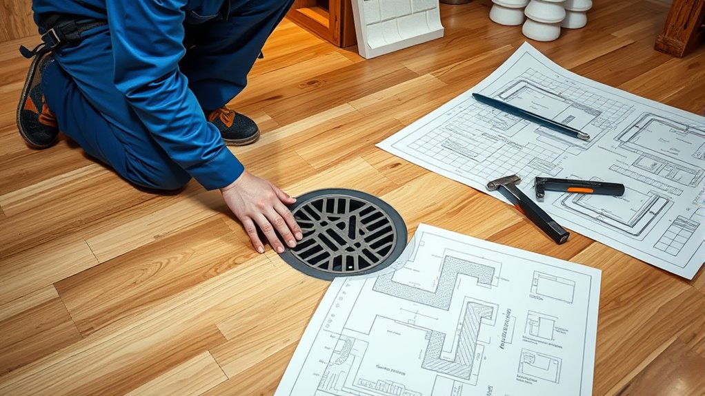 Handling flooring and drain work requires careful attention to safety to prevent injuries and accidents. Always wear personal protective equipment like gloves, goggles, and dust masks to shield yourself from debris, chemicals, and dust. Be mindful of electrical safety—turn off power before working near outlets or wiring to avoid shocks. Keep your workspace organized, so tools and materials don’t cause trips or falls. Use proper lifting techniques to prevent strains, and ensure ventilation when working with adhesives or sealants. Be cautious around sharp tools, and always follow manufacturer instructions for equipment. Remember, staying alert and prepared helps you avoid hazards and complete the job safely. Proper ventilation is essential when working with adhesives or sealants to reduce inhalation risks. Prioritize your safety first to keep your project on track and injury-free.