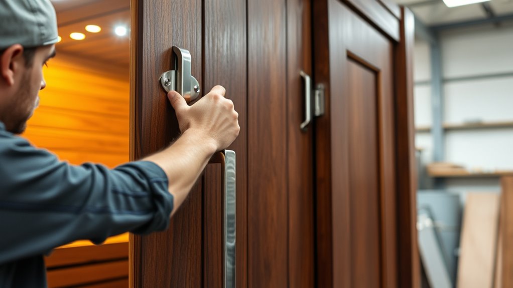 When selecting sauna doors and hardware, focus on durability, choosing corrosion-resistant materials like stainless steel or high-quality brass to withstand humidity and heat. Opt for a style that complements your sauna’s ambiance, such as glass for a modern look or wood for a cozy feel. Proper installation is key—ensure hinges are aligned and hardware is securely fastened. If you want to master the details, keep exploring how to make your sauna both functional and inviting.