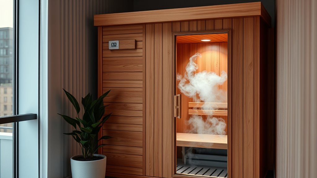 You should consider compact design sauna models that fit easily into small spaces. Foldable units are excellent because you can store them away when not in use, saving precious space. Look for saunas with slim profiles and lightweight materials, making setup and storage simple. These space-saving options let you enjoy a relaxing sauna experience without sacrificing your apartment’s comfort or functionality.