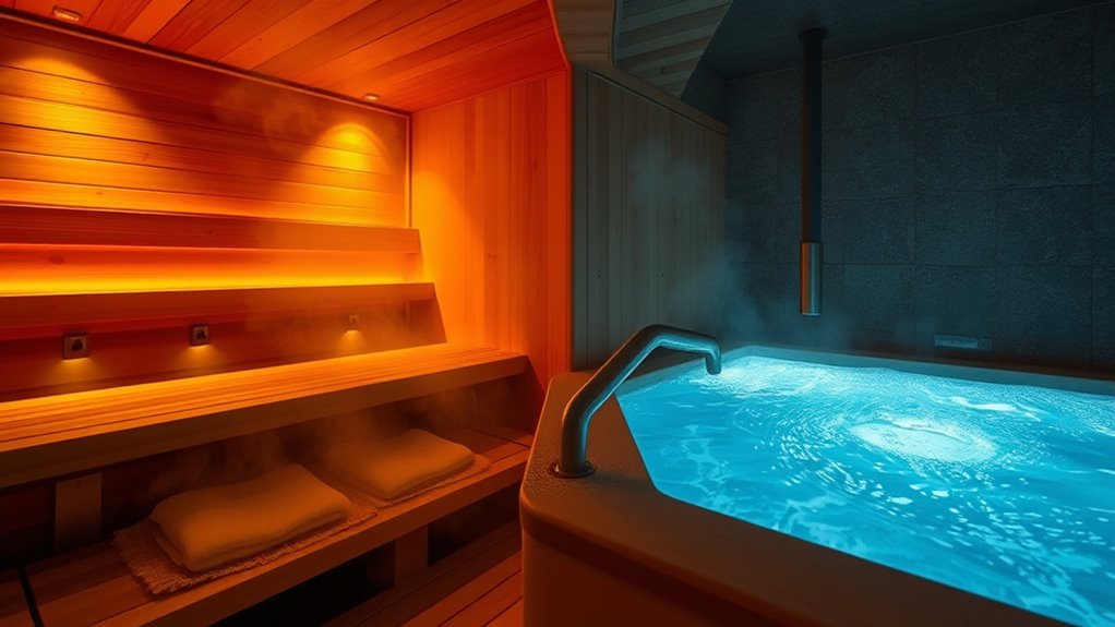 Contrast therapy, by alternating sauna and cold plunge sessions, helps you recover faster and boost physical performance. The heat relaxes muscles, increases blood flow, and reduces tension, while the cold reduces inflammation and sharpens mental clarity. This temperature switch stimulates your nervous system, enhances mood, and promotes a sense of refreshment. If you keep exploring, you’ll discover how to optimize these benefits safely and effectively for your recovery routine.