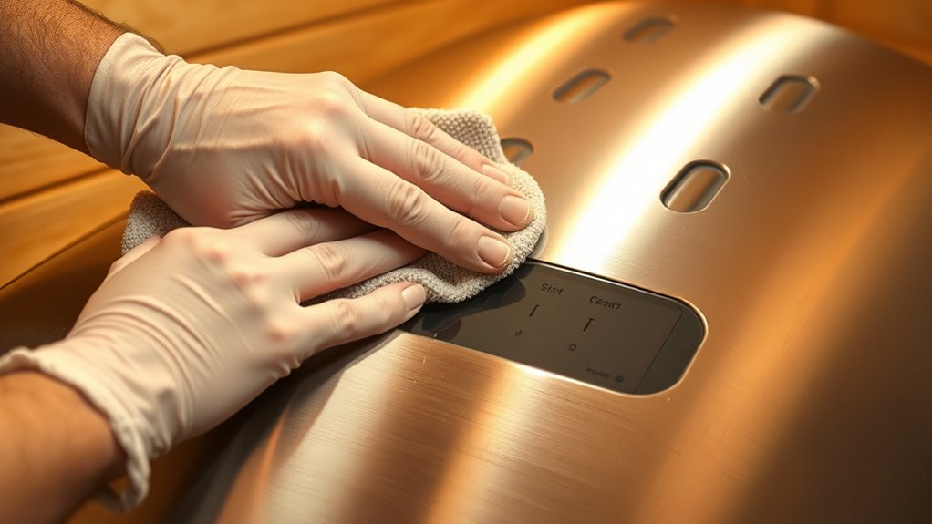 A key part of maintaining heater safety is staying on top of your cleaning schedule. Dust, dirt, and mineral buildup can accumulate on the heater’s elements and surrounding areas, impairing its performance and increasing fire risk. To keep everything in check, turn off and unplug the heater before cleaning. Use a soft, dry cloth or a gentle brush to wipe away dust from the exterior and any accessible parts. For mineral deposits, especially if you have hard water, you can use a damp cloth with a mild cleaner that’s safe for electrical components. Avoid using harsh chemicals or abrasive materials, as they can damage the heater’s surface or internal parts. Incorporate this cleaning routine into your regular sauna maintenance, ideally every few months or as recommended by the manufacturer. This not only enhances heater safety but also ensures the heater heats evenly and responds promptly when you turn it on. Regular inspections can also help identify the need for professional servicing, which is crucial for maintaining electrical safety and performance.