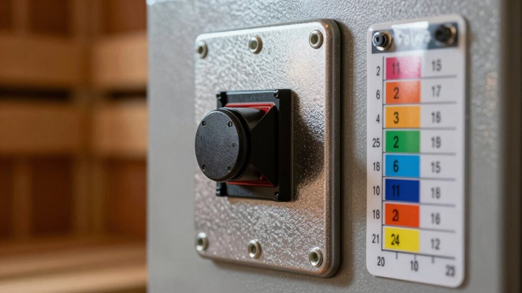 Upgrading your sauna’s wiring and breaker system is essential for guaranteeing both safety and ideal performance. Proper wiring prevents overheating and electrical hazards, especially if you’ve upgraded your sauna heater insulation or changed heater placement. Use the correct wire gauge to handle the load safely. Make sure your breaker matches the heater’s amperage requirements, preventing trips or potential fires. Here’s a quick guide: