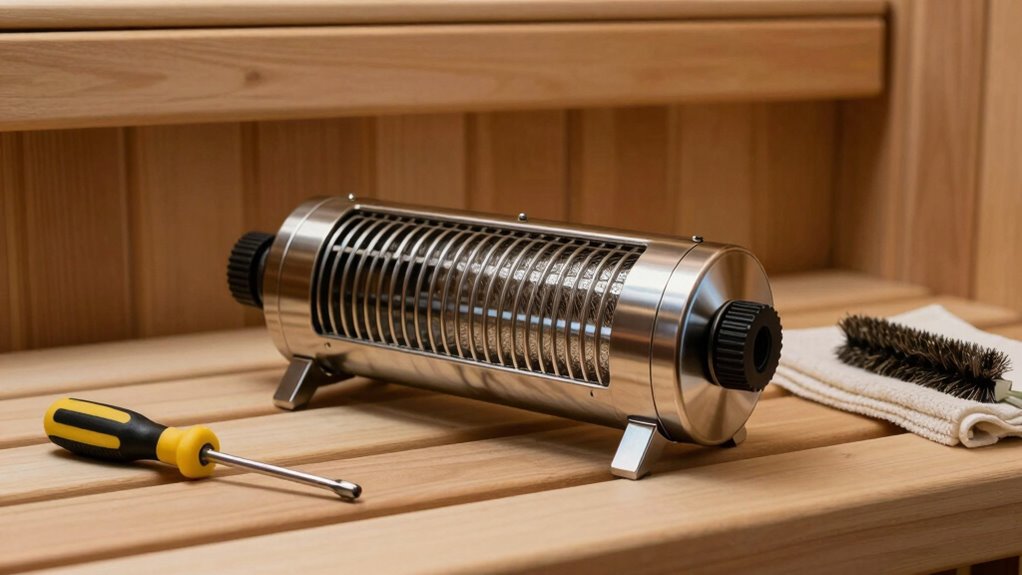 Inspecting your sauna heater’s heating elements is a crucial step in maintaining its efficiency and safety. Over time, elements can degrade, affecting heating performance and safety. To assess their condition, look for signs of wear, such as cracks or discoloration, which indicate reduced heating element durability. Regular inspections help determine the right element replacement timing, preventing unexpected failures. Additionally, using top car protection can help preserve your sauna heater from environmental elements if it’s installed outdoors.