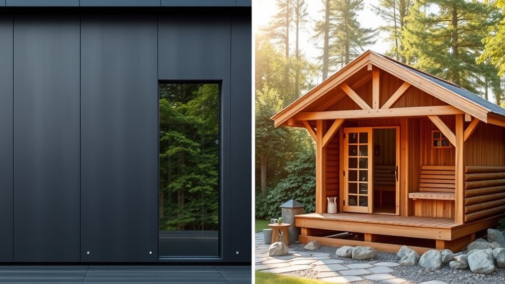 You should choose durable materials like wood siding and stone accents for your outdoor sauna exterior. Wood siding offers a natural, rustic look and is easy to customize, while stone accents add stability and a modern touch. These materials withstand weather, require minimal maintenance, and blend seamlessly with outdoor environments. Combining wood and stone provides a balanced aesthetic, ensuring your sauna looks appealing and stays protected year-round.