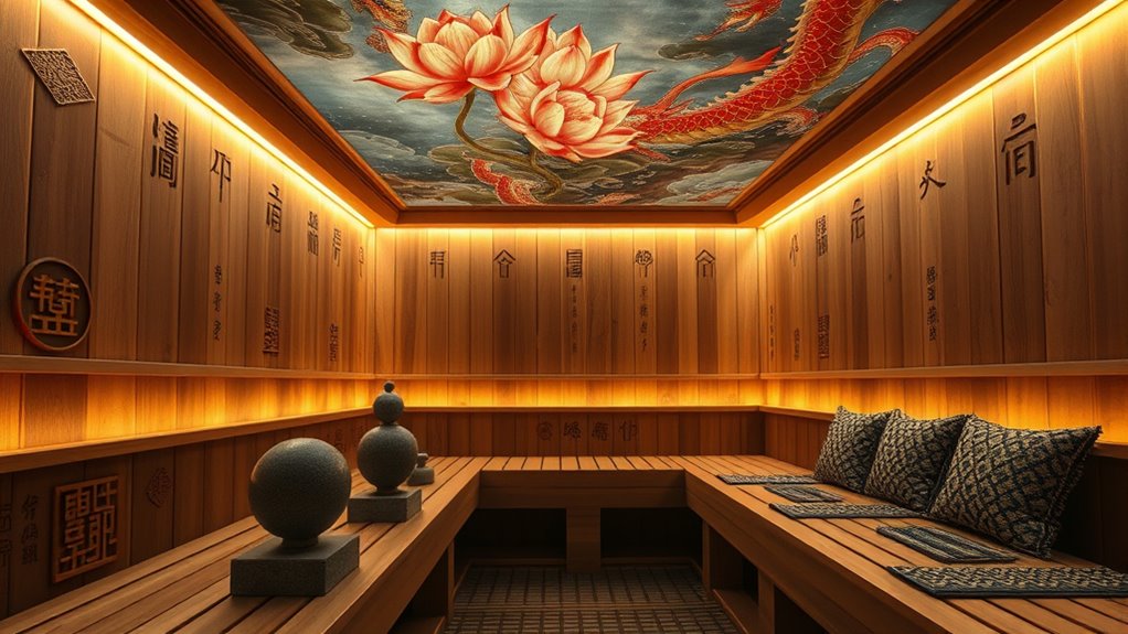 Incorporating art and cultural motifs into sauna design allows you to create a personalized, meaningful space that reflects your heritage and style. You can add handcrafted carvings, murals, or symbols that speak to your background, enhancing the atmosphere and deepening your connection to the environment. Thoughtful lighting highlights these artistic elements, making your sauna a visual and spiritual sanctuary. Keep exploring how to seamlessly blend tradition and design to inspire your own unique retreat.