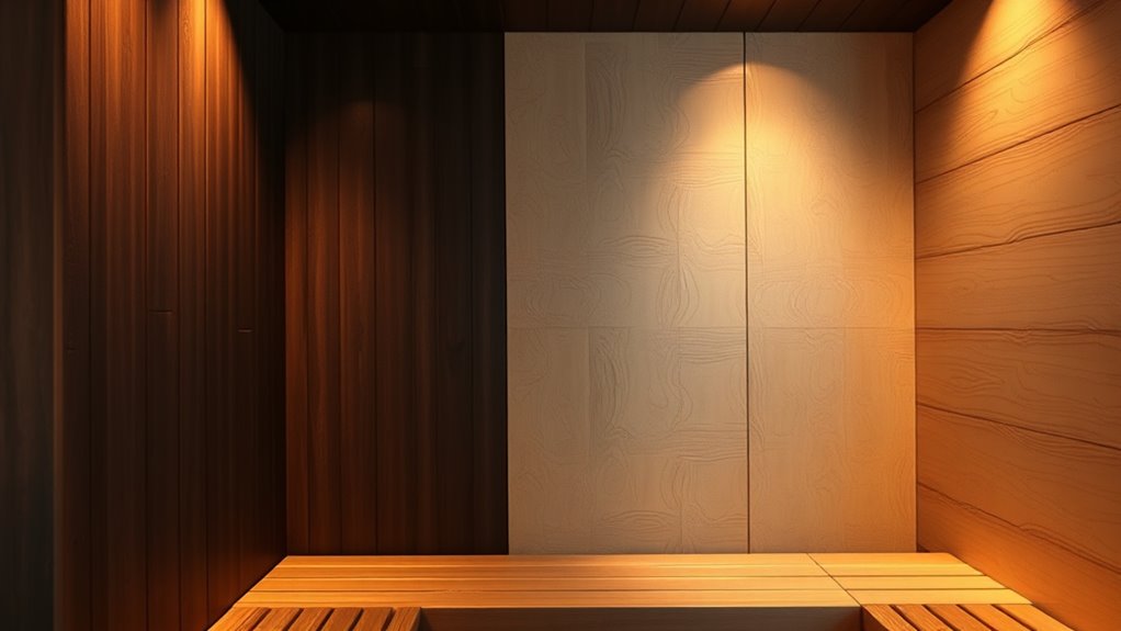 You might think light finishes are more resistant to moisture damage, but the truth isn’t that simple. Light-colored woods often have tighter grain structures, reducing moisture absorption and enhancing finish durability. This means they handle humidity swings better, preventing warping or cracking. If you want your sauna to withstand moisture over time, opting for light finishes could be a smarter choice, offering both aesthetic appeal and resilience against the elements.