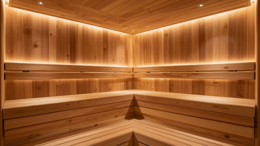 You should opt for indirect lighting in your sauna, as it creates a calming atmosphere that enhances mood and promotes relaxation. Indirect lighting also offers better energy efficiency, reducing power consumption while maintaining an inviting glow. Direct lighting may be too harsh and can disturb the tranquil spa vibe you’re aiming for. So, go for concealed or soft fixtures to achieve mood enhancement and energy savings, making your sauna experience more enjoyable.
