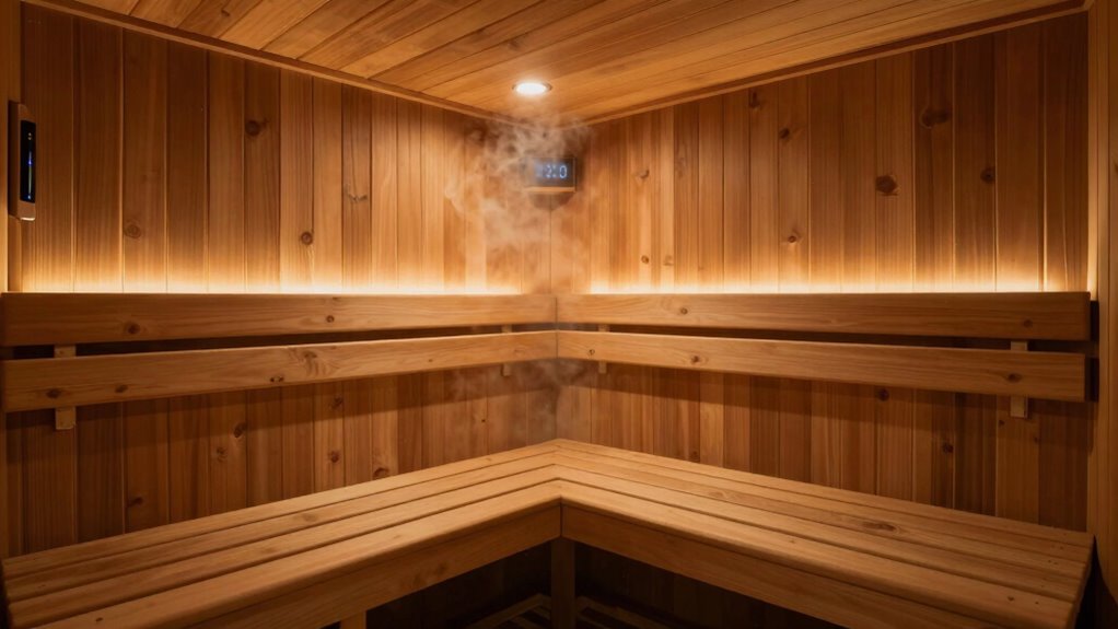 Optimizing your sauna’s size and layout sets the foundation for a comfortable experience, but safety and comfort go beyond just space considerations. To guarantee a safe and enjoyable sauna session, focus on proper interior decor and maintenance tips that enhance safety and comfort.