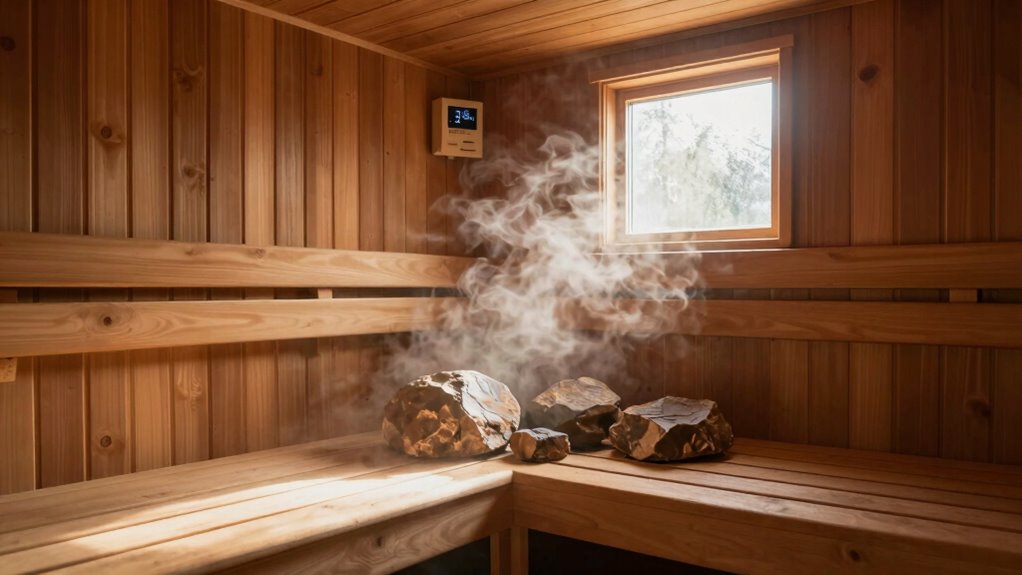 Adjusting your sauna’s temperature and humidity levels is essential for a comfortable and enjoyable experience. To fine-tune the atmosphere, start by setting the temperature to your preference, then modify humidity using water on the rocks or a humidifier. Consider how sauna lighting influences ambiance—softer lights can create a calming environment, while brighter lights energize the space. Incorporate aromatherapy effects by adding essential oils to the water or diffuser, enhancing relaxation. Additionally, choosing affordable jewelry gifts can add a thoughtful touch to your sauna experience by creating a serene and inviting atmosphere. Use the table below to better understand your options: