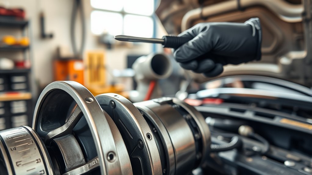 Detecting exhaust vent blockages is essential for maintaining proper airflow and preventing system failures. When vents are clogged, airflow sensors may signal reduced exhaust flow, alerting you to a problem. To identify blockages, start by inspecting the vent visually for debris or obstructions. Use duct cleaning tools to clear out any buildup that might restrict airflow. Additionally, monitor airflow sensor readings; low or inconsistent signals often indicate a blockage. You can also perform a simple airflow test: if exhaust gases linger or the vent feels unusually hot, it’s likely obstructed. Regular maintenance and inspection help prevent blockages before they cause damage, ensuring ideal ventilation and system efficiency. Staying vigilant with these methods keeps your exhaust system running smoothly. Incorporating proper maintenance techniques can further enhance system longevity and safety.