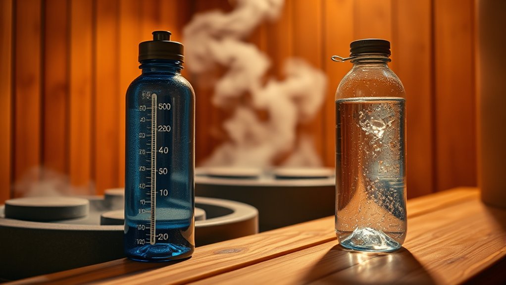 Sure, you can pretend you’re hydrating perfectly while secretly engaging in hydration monitoring denial. Symptoms of dehydration can be subtly concealed during sauna use, making it easy to ignore thirst or dizziness. This symptom concealment tricks you into thinking you’re fine, but your body’s crying out for fluids. Stay vigilant—don’t let the sauna’s warm embrace fool you into ignoring signs of dehydration. Drink water regularly, even if you feel perfectly fine.