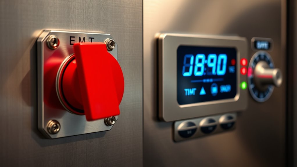 Emergency shutoff and temperature control systems are vital safety tools that automatically detect hazards and respond quickly to prevent accidents. They protect your equipment and personnel by preventing overheating, freezing, or other dangerous conditions. Regular maintenance, clear protocols, and proper training ensure these systems work reliably when needed. Understanding how these systems operate helps you improve safety measures. Keep exploring to discover key components and best practices for effective safety management.
