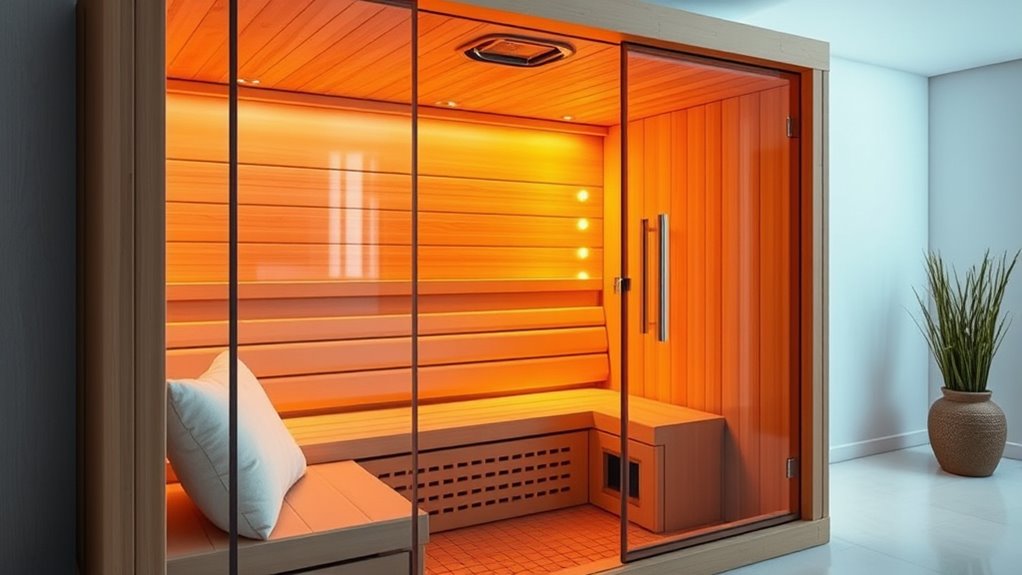 Choosing high-quality build materials is essential when selecting a Huum infrared sauna because they directly impact durability, safety, and performance. I look for saunas made from Canadian Hemlock or similar premium woods, as they’re resistant to decay and provide stability over time. Tempered glass panels on doors and sides add safety, enhance longevity, and look sleek. Low EMF construction with advanced carbon fiber or ceramic panels minimizes electromagnetic radiation, making the sauna safer for health. Good insulation from quality wood panels and sealed joints improves heat retention and energy efficiency, ensuring consistent performance. Additionally, eco-friendly paints and water-based finishes not only protect the material but also contribute to a healthier indoor environment and a longer-lasting product.