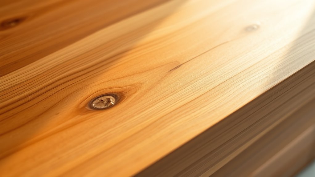 When it comes to non-toxic wood finishes, durability and longevity are vital for guaranteeing your project withstands daily use. Finishes with high oil content, like linseed oil or beeswax, form a protective barrier that helps resist wear and moisture. The curing process and applying multiple coats are essential; proper curing ensures the finish remains resilient over time. Finishes designed for heirloom or high-traffic furniture tend to hold up better, maintaining their protective qualities longer. Regular maintenance and touch-ups can also extend the lifespan, especially since natural ingredients like beeswax are easy to repair without stripping or sanding. Overall, choosing a finish that combines natural robustness with proper application and upkeep guarantees your project stays beautiful and protected for years.