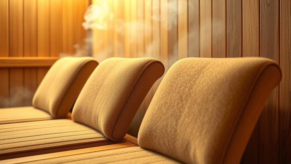 Think of your skin as a delicate garden needing gentle care. For sensitive skin, I recommend backrests made from natural, hypoallergenic materials like cedar or bamboo. These woods are smooth, breathable, and less likely to irritate. Avoid synthetic or heavily treated woods, which can cause discomfort. Using a backrest crafted from gentle, natural materials helps you relax fully without worry, making your sauna experience truly soothing and safe.