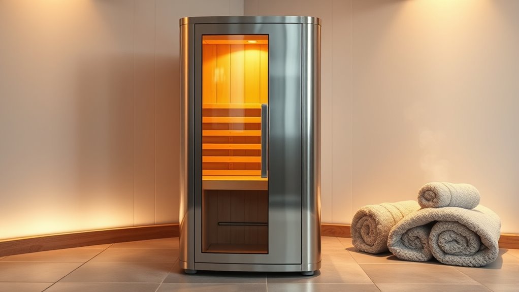 To maximize energy efficiency in your indoor sauna, it’s important to contemplate several key factors that influence power consumption and heat retention. First, look for sauna heaters that consume less power while delivering sufficient heat, helping reduce electricity costs. Infrared panels and ceramic heating elements with low EMF are designed to produce maximum heat output efficiently. The quality of insulation and proper sealing of your sauna also plays a crucial role—better insulation keeps heat inside, lowering the energy needed to maintain temperature. Adjustable thermostats allow for precise temperature control, preventing unnecessary energy use. Additionally, modern heaters with smart technology or timers enable automatic shutoff and scheduled operation, ensuring you don’t waste energy when the sauna isn’t in use.