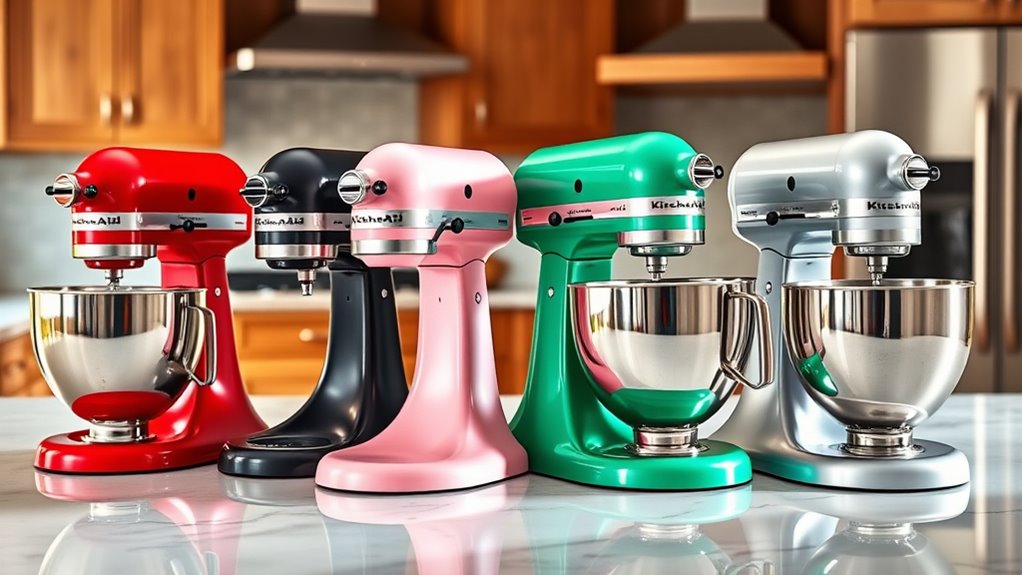 Your personal style plays a significant role in selecting a KitchenAid stand mixer color that feels right for you. I believe your choice should reflect your personality, whether you prefer bold, vibrant shades or soft pastels. Picking a color that matches your kitchen decor can create a cohesive look and make your space feel more inviting. Consider how the mixer’s hue complements your overall design—vibrant reds can add energy, while neutral tones offer versatility. Think long-term, too; choose a color you’ll enjoy as your style evolves. Ultimately, your mixer should be an expression of your taste, blending functionality with aesthetic appeal, making it a true reflection of who you are.