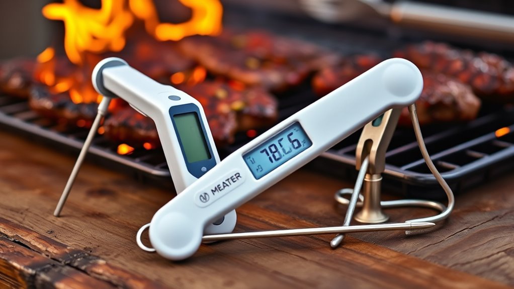 Ensuring your meat thermometer is compatible with your devices is vital for seamless grilling. First, check if it works with your smartphone or tablet’s operating system, whether iOS or Android. Compatibility with Bluetooth or Wi-Fi is essential, depending on your preferred wireless range and convenience. Make sure the thermometer’s app is available and regularly updated on your device’s app store; this guarantees best performance and access to new features. If you’re into smart home integration, verify if the thermometer supports voice assistants or smart systems for added convenience. Finally, consider the wireless range—make sure it can monitor your meat from the distance you typically grill. Compatibility ensures a smooth experience and keeps your focus on cooking, not troubleshooting tech issues.
