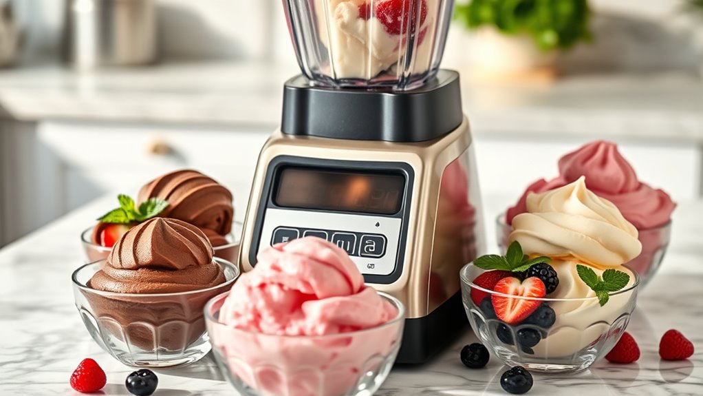 Since ingredient versatility plays a crucial role in crafting a variety of frozen treats, it’s important to take into account how flexible your ingredients are when choosing Ninja Creami Deluxe recipes. Versatile ingredients let you create everything from creamy ice creams to tangy sorbets using fruits, dairy, or plant-based options. They also allow for easy customization to suit dietary needs like vegan, low-sugar, or gluten-free preferences, broadening the appeal of your desserts. Incorporating mix-ins such as nuts, chocolate, or fruit chunks adds flavor and texture variety. Flexible ingredients encourage experimentation, letting you craft unique, personalized treats. Plus, using common pantry staples means you can whip up gourmet-quality frozen desserts without relying on specialized or hard-to-find products, making your options endless.