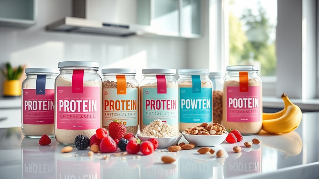 If you’re looking for protein powders with minimal artificial sweeteners, I recommend checking labels carefully. I prefer options like Naked Whey, which is just pure whey protein with no added sweeteners, or Orgain Organic Plant-Based Protein, which uses natural ingredients. These choices help me avoid unnecessary chemicals. Always read ingredient lists to make certain you’re getting a product with clean, natural components that suit your taste and dietary needs.