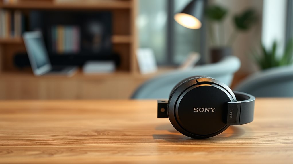 Choosing the right headphones means prioritizing comfort and fit, especially for long listening sessions. I look for adjustable headbands and cushioned ear cups to guarantee a snug yet comfortable feel. Lightweight materials like carbon fiber and synthetic leather help reduce fatigue during extended wear. An ergonomic, wider, asymmetrical headband distribution minimizes pressure points on my head and neck, making all-day use more comfortable. Seamless swivel and stepless sliders allow me to customize the fit precisely, making sure they stay secure without pinching. Proper fit isn’t just about comfort—it also enhances noise cancellation and microphone performance, especially in noisy or active environments. When headphones fit well, I can enjoy my music or calls without distraction or discomfort, making the Sony WH-1000XM6 a top choice for all-day listening.