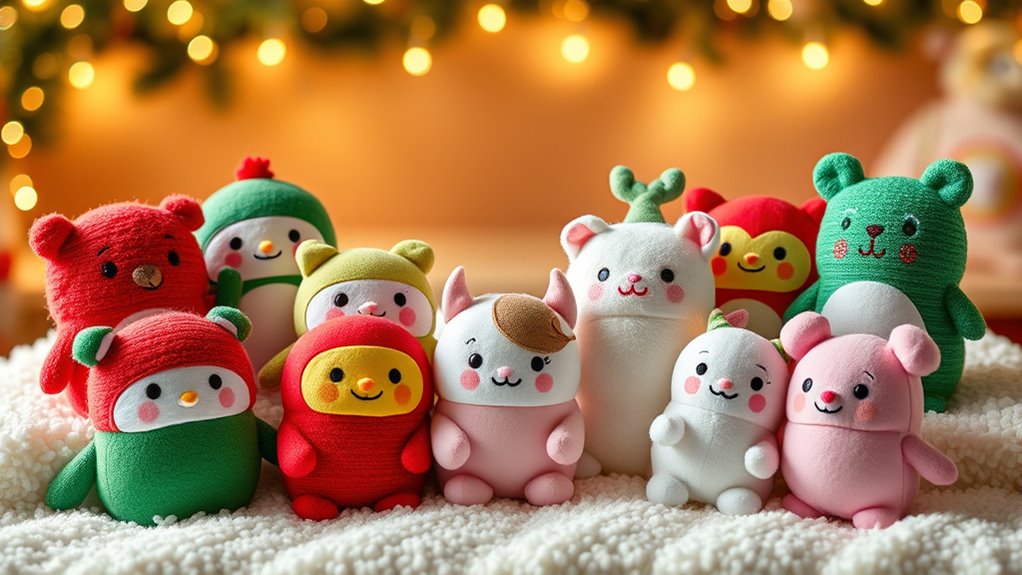 If you’re looking for the top holiday Squishmallows in 2025, fans love their festive charm and cuddly appeal. Favorites include the 12-inch Tolef Cookie Bear, Emmy the Christmas Elf, Brooke Polar Bear, and the Grinch with Heart. Seasonal mystery capsules and characters like Richie the Axolotl and Rudolph add extra fun. Each plush combines soft materials with limited edition designs, making them great collectibles and holiday gifts. Keep going to discover more about these adorable seasonal favorites.