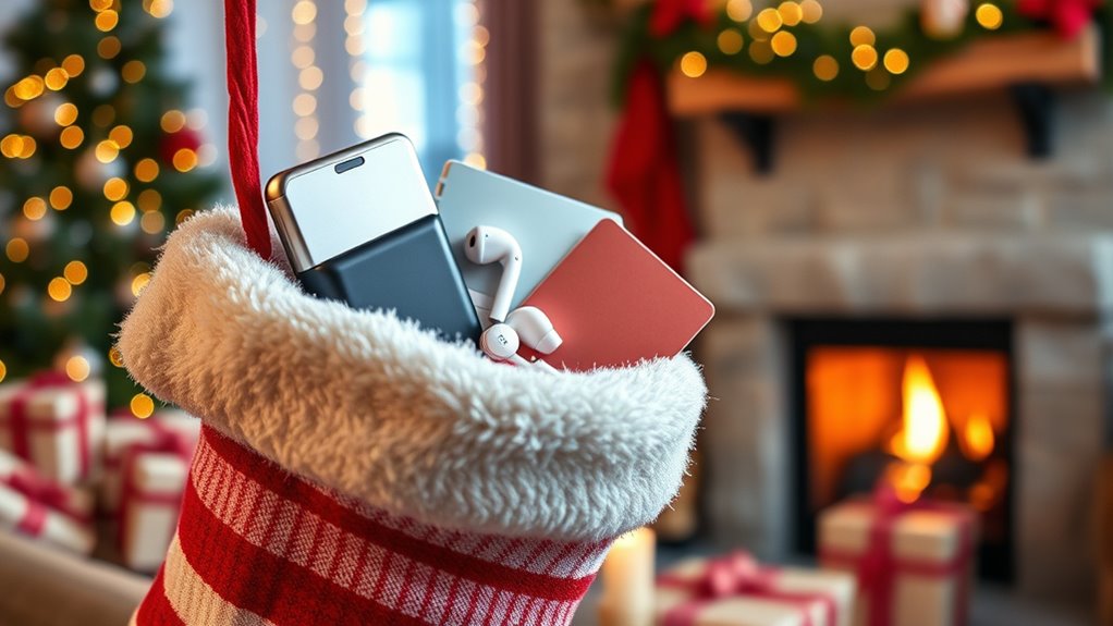 Imagine giving a key to open endless possibilities—tech gadgets are just that for students. I’d suggest portable chargers, smart notebooks, or wireless earbuds—tools that symbolize empowerment and connection. These gadgets boost productivity and keep them connected to what matters most. They’re unique, practical, and show you care about their growth. Plus, they fit perfectly in a stocking, making their holiday both memorable and meaningful.