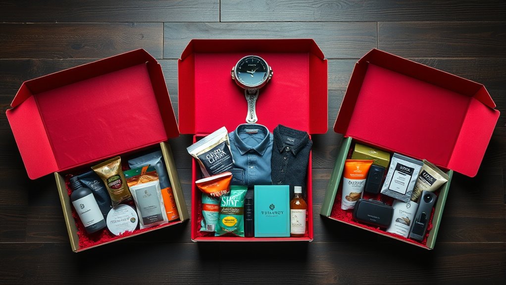 Since reliable delivery keeps the process smooth, I also pay close attention to the customization options offered by subscription boxes for men. Customization guarantees the experience feels personal and thoughtful. Many boxes let you choose preferences or add curated items based on hobbies, interests, or dietary needs, making the gift more relevant. Some services even offer personalized packaging, messages, or themed items for special occasions, adding a special touch. Being able to tailor the contents and delivery frequency helps keep the recipient engaged and satisfied, making the subscription more meaningful. Flexible options allow you to match the gift to their unique tastes, ensuring it’s not only a surprise but also genuinely appreciated. Customization truly elevates the overall experience and makes the subscription memorable.