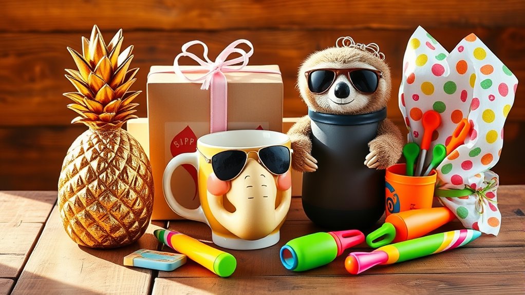 Opting for a unique and fun white elephant gift can turn a simple exchange into a memorable event. I look for items with humorous designs or personalized touches that really stand out. Quirky themes or unexpected shapes spark conversation and add an element of surprise. Gifts under $50 that are playful or novelty in nature tend to be more entertaining and appreciated for their lighthearted spirit. Creative packaging or multi-purpose functionality also boosts the gift’s appeal, making it more memorable. Incorporating trending pop culture references or amusing designs can elevate the novelty factor and make the gift unforgettable. Ultimately, choosing something fun and distinctive guarantees the gift will be the highlight of the exchange, encouraging laughter and lively discussion among everyone involved.