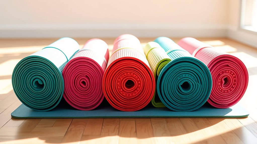 Thicker yoga mats, usually 1/2 inch or more, offer extra cushioning that helps protect your joints and makes poses more comfortable. This added padding absorbs impact from jumps, kneeling positions, and other high-pressure poses, making your practice more enjoyable and reducing discomfort. However, too much thickness can affect stability, especially for poses that require precise footing, so finding a balance is key. A well-chosen thickness provides sufficient support without sacrificing grip or stability. For beginners, a moderate thickness can help improve confidence and comfort, especially during longer sessions. Remember, the goal is to find a mat that cushions your joints while still allowing you to maintain control and balance during your practice.