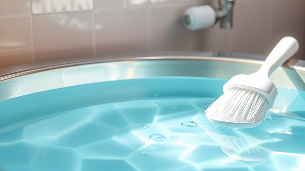 Yes, you can use water softening and pH balancing treatments to prevent limescale formation. Water softeners remove calcium and magnesium ions that cause scale, while pH balancing helps maintain ideal water chemistry, reducing mineral deposits. Regularly applying these treatments ensures your cold plunge equipment stays free of limescale, extending its lifespan and maintaining water quality. Always follow manufacturer instructions for the best results and safety.